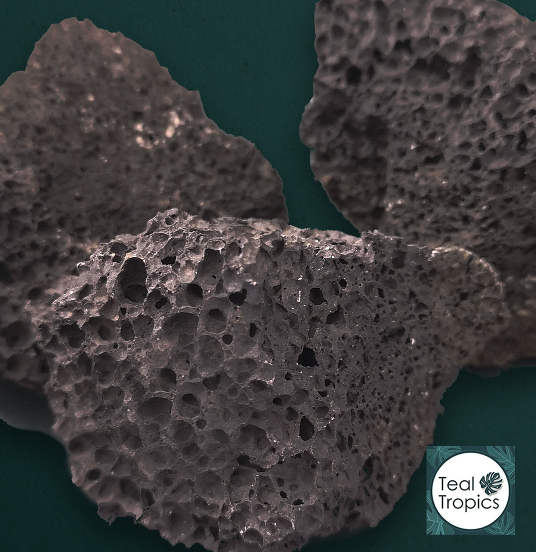Dark black lava rock chunks. Rough and airy texture. Perfect for planting mosses on.